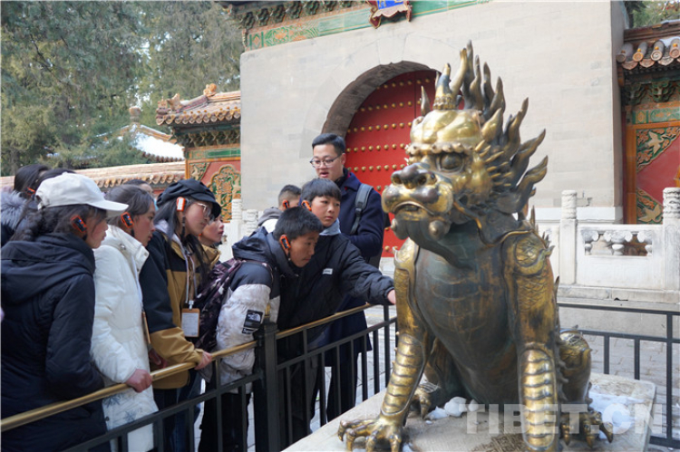 原來宮殿的排水系統(tǒng)既科學(xué)又美觀,原來屋脊神獸有避雷的作用,原來宮殿前的動物造型香爐是古代版“舞臺干冰制造器”……故宮的建造元素如此豐富,來自各個地區(qū)和民族。隨著講解員的介紹,同學(xué)們被古人的智慧深深折服,對這座皇家園林有了了解和自己的認(rèn)識。站在宮殿的高處,學(xué)生們遙望到矗立的白塔,遙望到屋頂龍形裝飾的雨花閣,據(jù)說里面都是清朝皇帝收藏關(guān)于藏傳佛教的“寶物”,那里有關(guān)于西藏的歷史故事。