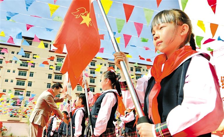 5月30日,拉薩市在實(shí)驗(yàn)小學(xué)東城分校舉行以“紅領(lǐng)巾愛祖國”為主題的一年級新隊(duì)員入隊(duì)儀式暨“紅領(lǐng)巾獎?wù)隆蔽逍钦骂C章儀式。儀式現(xiàn)場,老隊(duì)員們鄭重地為新隊(duì)員佩戴紅領(lǐng)巾,大隊(duì)輔導(dǎo)員帶領(lǐng)新老隊(duì)員宣讀入隊(duì)誓詞,隊(duì)員們激情唱響《我們是共產(chǎn)主義接班人》,嘹亮的歌聲在校園回蕩。