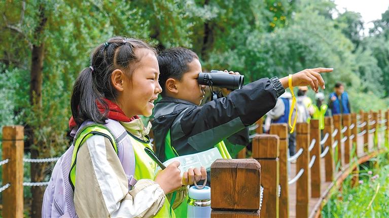 圖為小朋友在國家級自然保護區(qū)拉魯濕地觀察花草、鳥類。記者 鹿麗娟 攝
