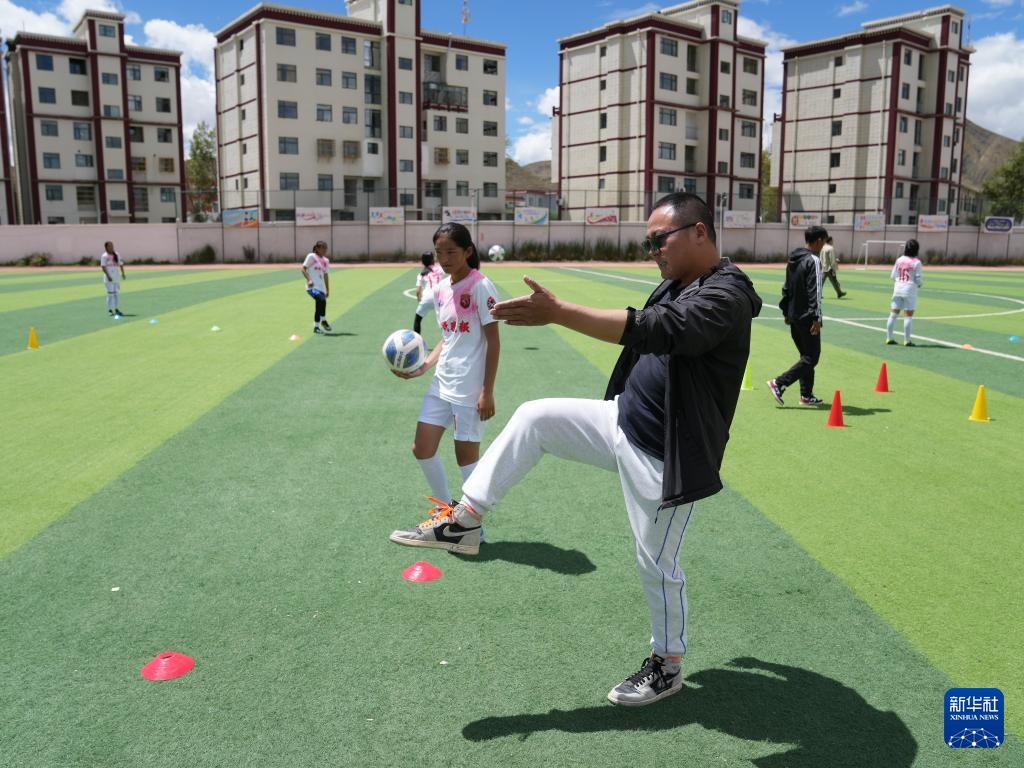 西藏日喀則市上海實(shí)驗(yàn)學(xué)?!爸榉逖棥迸幼闱蜿?duì)教練洛布桑在操場(chǎng)上指導(dǎo)球員訓(xùn)練(9月3日攝)。新華社記者 丁汀 攝