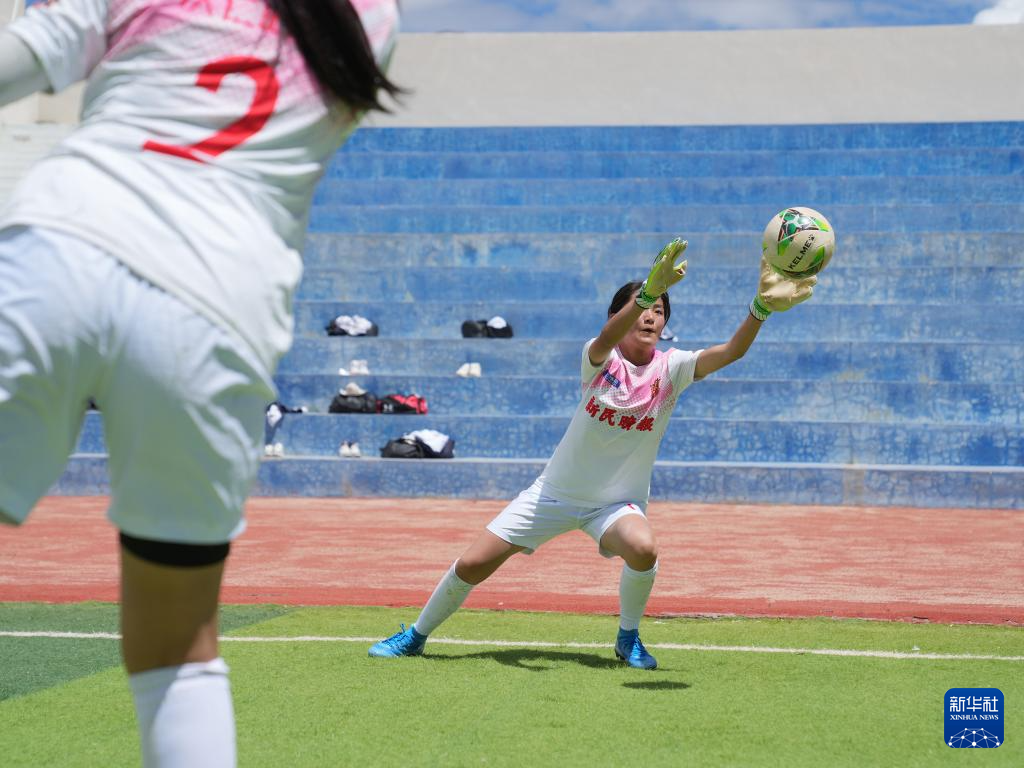 在西藏日喀則市上海實(shí)驗(yàn)學(xué)校,“珠峰雪鷹”女子足球隊(duì)守門員邊普在操場(chǎng)上訓(xùn)練(9月3日攝)。新華社記者 丁汀 攝