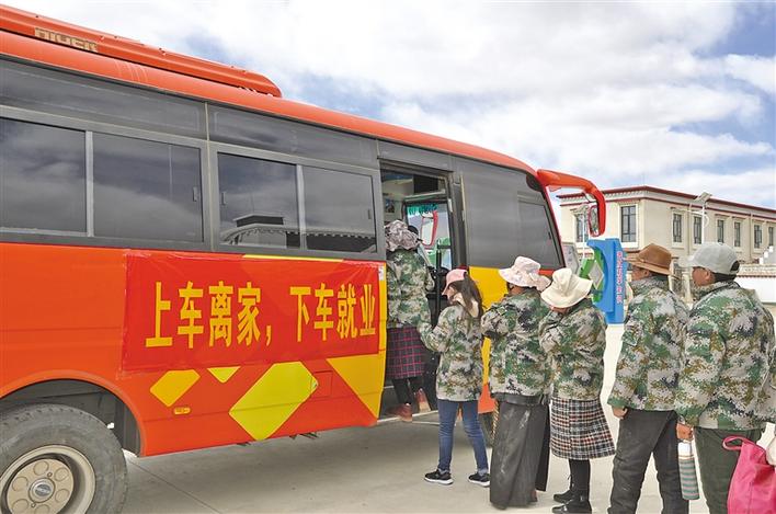 圖為近日桑珠孜區(qū)江當(dāng)鄉(xiāng)郭加新村52名農(nóng)牧民群眾,搭乘當(dāng)?shù)卣赓M(fèi)提供的大巴車(chē),有序前往白朗縣蔬菜產(chǎn)業(yè)園務(wù)工。記者 汪純 攝