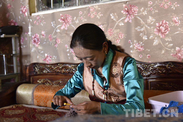圖為西藏自治區(qū)阿里地區(qū)改則縣圓夢新居易地扶貧搬遷點居民扎西頓珠的妻子索南措姆在編織 攝影:王媛媛