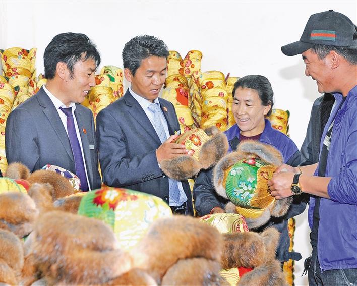 農行山南扎囊縣支行客戶經(jīng)理(左二)來到扎囊縣扎塘鎮(zhèn)羊嘎村藏式帽子次仁金果農民專業(yè)合作社對接產業(yè)扶貧項目。