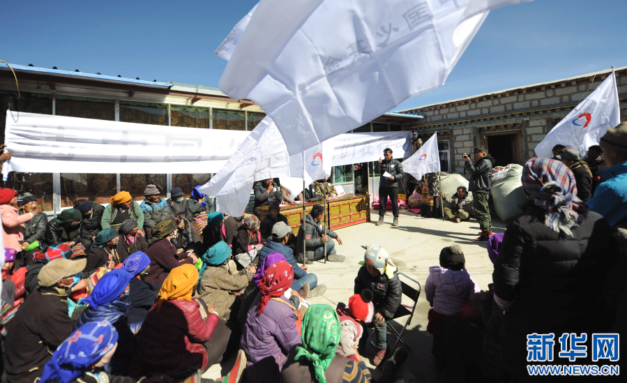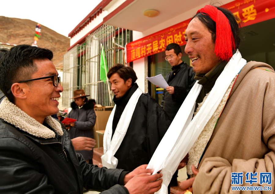 西藏山南市浪卡子縣浪卡子鎮(zhèn)道布龍居委會里,駐村工作隊隊員在給村民講入股居委會集體經濟的事情。(2018年2月12日攝)新華社記者 晉美多吉 攝