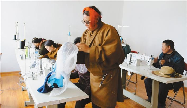 圖為在巴青縣扶貧服裝加工廠,拉加(右一)和工人們正在縫制衣服。記者 萬(wàn)靖 攝