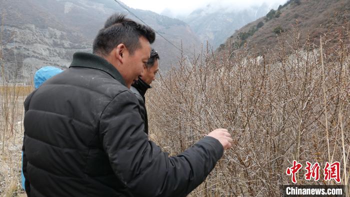 圖為次仁多布杰在查看沙棘生長(zhǎng)情況 謝牧 攝