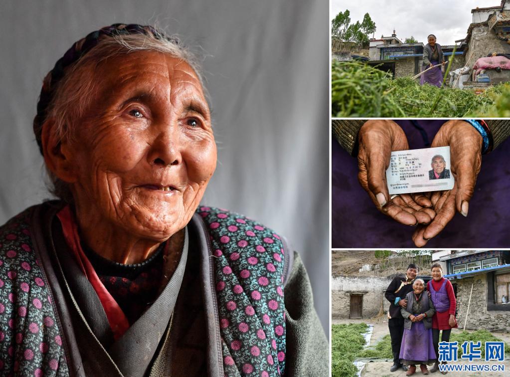 家住西藏山南市乃東區(qū)亞堆鄉(xiāng)曲德沃村的次仁央宗老人。左:次仁央宗老人的肖像。右上:次仁央宗老人在曬牧草。右中:次仁央宗老人的身份證。右下:次仁央宗和子女的合影。 新華社記者 晉美多吉6月3日攝