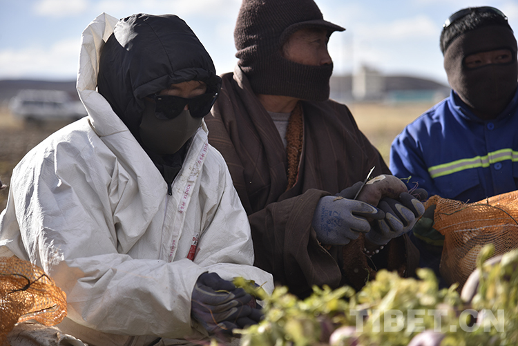 圖為嘎?tīng)柕律鷳B(tài)畜牧產(chǎn)業(yè)示范基地里員工正收割芫根 攝影:王媛媛