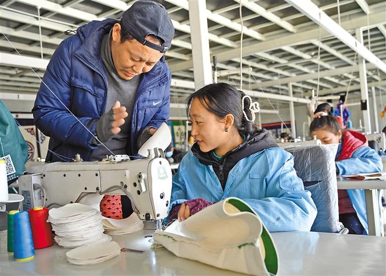 圖為西藏古傳民族手工業(yè)有限公司的老師在教授學(xué)員縫紉技巧。記者 洛桑 攝