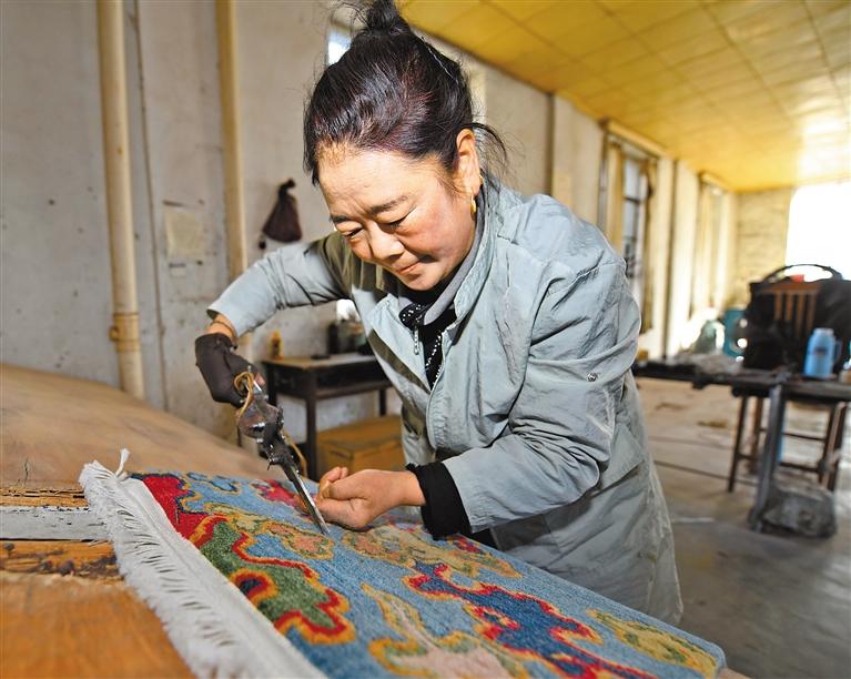 左圖為拉薩喀瓦堅(jiān)手工藏毯公司工人對(duì)藏毯進(jìn)行立體裁剪。 記者 唐斌 攝