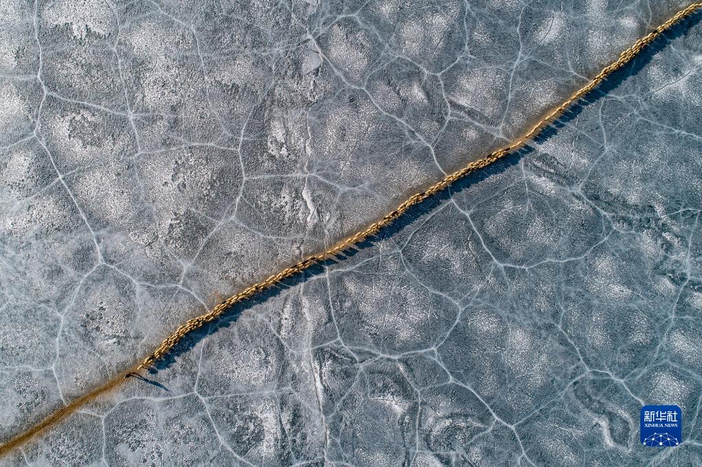 羊群順著安全小路通過普莫雍錯冰湖。新華社記者 孫瑞博 攝