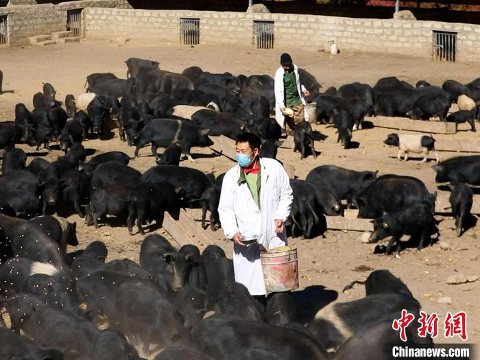 圖為飼養(yǎng)員正在給藏香豬喂食。 土旦曲扎 攝