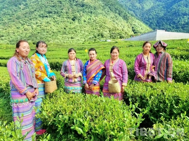 圖為羅布央宗(左一)和村民在茶園工作間隙合影