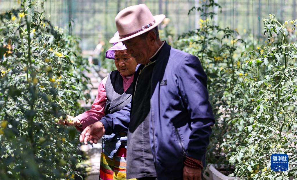 5月28日,參觀者在白朗縣珠峰博覽園的玻璃溫室中采摘蔬菜。新華社記者 姜帆 攝