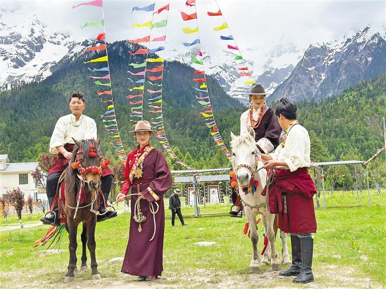 波密縣扎木鎮(zhèn)康木村坐落于318國道旁,風(fēng)景秀麗,群山環(huán)繞,很多自駕游的游客都會經(jīng)停于此體驗(yàn)藏家文化。 圖為游客在康木村,穿著藏裝體驗(yàn)騎馬樂趣。 圖片由本報記者 張猛 攝