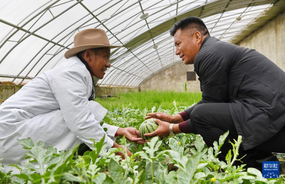 措勤縣農(nóng)牧業(yè)技術(shù)推廣站站長吾金次仁(右)和措勤縣高原生態(tài)畜牧業(yè)現(xiàn)代化養(yǎng)殖一體化產(chǎn)業(yè)綜合基地合作社負責(zé)人扎西桑布在西瓜大棚里交流(8月19日攝)。新華社記者 張汝鋒 攝