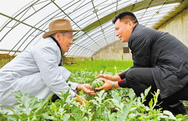 圖為措勤縣農(nóng)牧業(yè)技術(shù)推廣站站長吾金次仁(右)和措勤縣高原生態(tài)畜牧業(yè)現(xiàn)代化養(yǎng)殖一體化產(chǎn)業(yè)綜合基地合作社負責(zé)人扎西桑布在西瓜大棚里交流。 新華社記者 張汝鋒 攝
