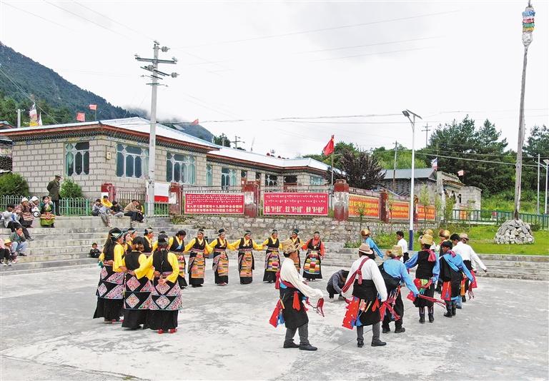 日喀則市吉隆縣達曼村群眾在村廣場上載歌載舞。記者 李洲 攝