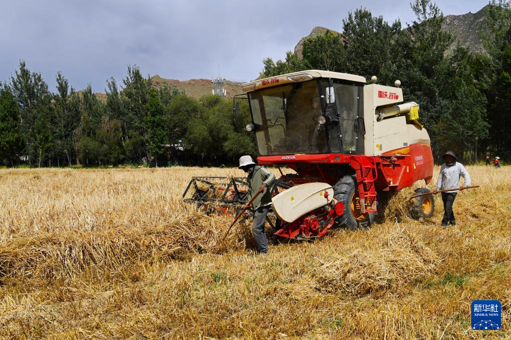 ??工作人員駕駛農業(yè)機械在西藏拉薩市林周縣曲果強村的高標準農田里收獲小麥(10月12日攝)。新華社記者 張汝鋒 攝