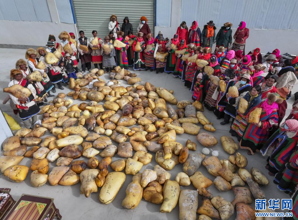 合作社為社員發(fā)放畜產品(11月28日攝)。新華社發(fā)(索朗仁青 攝)