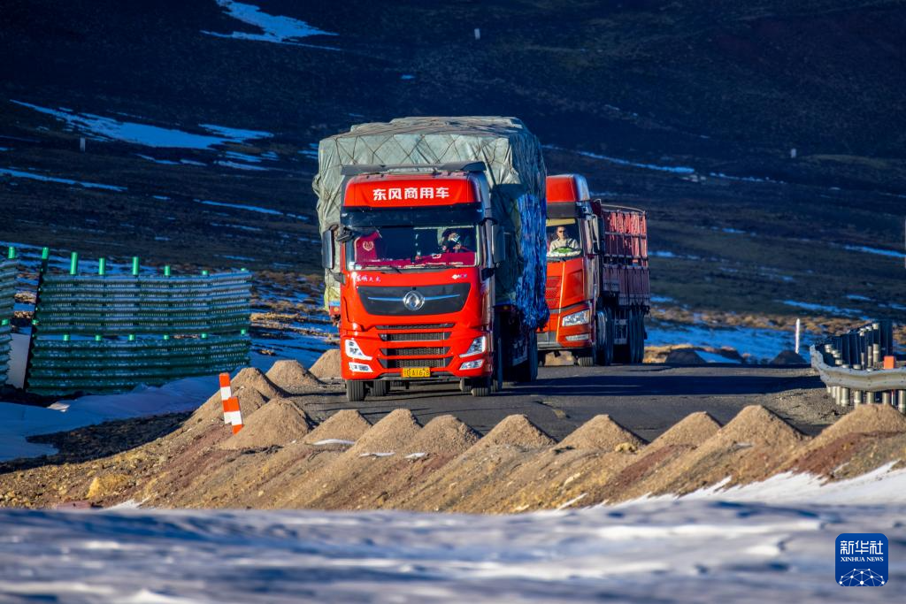 運載著申扎縣供銷合作社為偏遠鄉(xiāng)鎮(zhèn)果蔬配送試點項目從西寧采購的50噸新鮮果蔬的貨車經過唐古拉山口(1月3日攝)。新華社記者 曹檳 攝