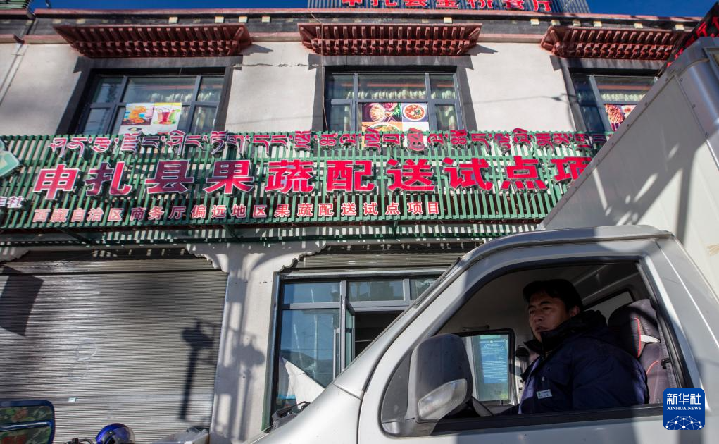 申扎縣供銷合作社的配送員巴拉從縣城總店出發(fā),為馬躍鄉(xiāng)貝嘎四村偏遠鄉(xiāng)鎮(zhèn)果蔬配送試點項目直銷點運送新鮮果蔬(1月5日攝)。新華社記者 姜帆 攝