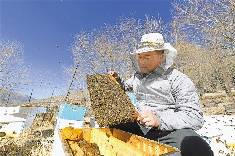 夜伴蜂聲西藏蜜蜂文化主題生態(tài)園位于山南市乃東區(qū)結(jié)巴鄉(xiāng)結(jié)巴村,是山南市第一個自然科普研學(xué)基地。近年來,園區(qū)以養(yǎng)殖基地、體驗(yàn)基地、電商中心、生產(chǎn)工廠和科研基地五位一體模式,將蜜源植物觀光、蜜蜂養(yǎng)殖體驗(yàn)、蜜蜂文化宣傳、蜜蜂美食產(chǎn)業(yè)有機(jī)融合,促進(jìn)蜂產(chǎn)業(yè)與休閑觀光、鄉(xiāng)村旅游等深度融合,吸引更多當(dāng)?shù)剞r(nóng)民進(jìn)入養(yǎng)蜂行業(yè),實(shí)現(xiàn)增收致富。 圖為夜伴蜂聲西藏蜜蜂文化主題生態(tài)園的養(yǎng)蜂工人在換蜂箱。 本報(bào)記者 唐斌 攝