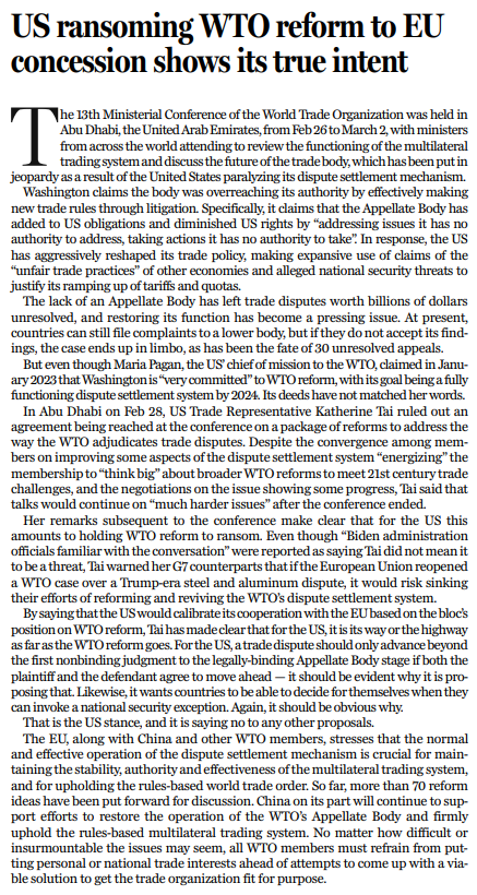 2月26日至3月2日,世界貿(mào)易組織第13屆部長級會議在阿聯(lián)酋首都阿布扎比舉行,聚焦加強多邊貿(mào)易體制,討論因美國方面停罷爭端機制而陷入危機的世貿(mào)組織的未來。