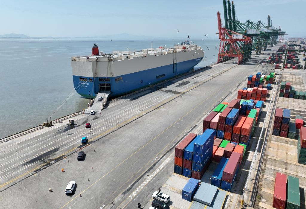 3月12日,準(zhǔn)備出口的車輛從福州港江陰港區(qū)碼頭駛上遠(yuǎn)洋滾裝輪(無人機(jī)照片)。新華社記者林善傳攝