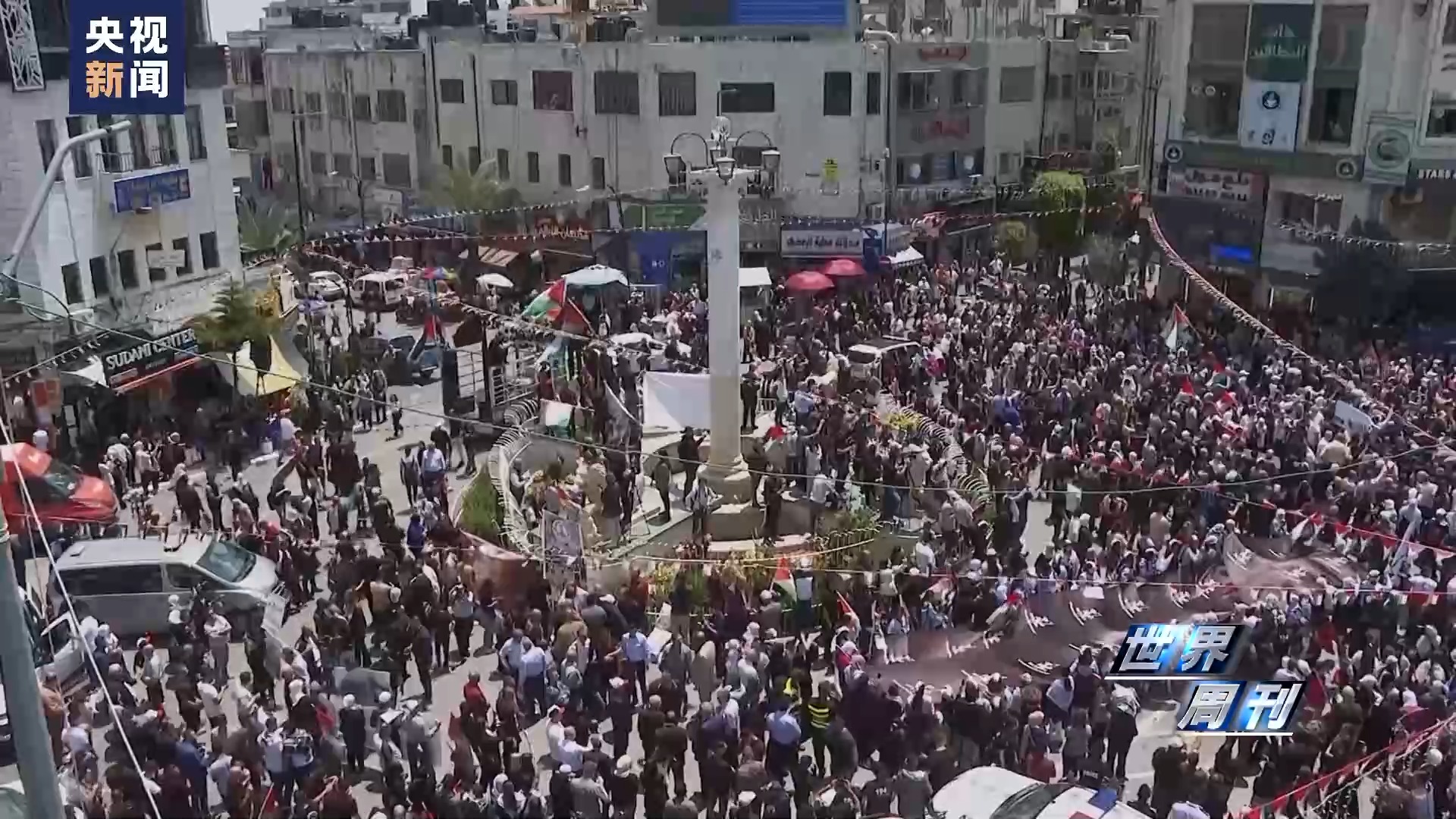5月15日當天,約旦河西岸城市拉姆安拉,數(shù)千名民眾參與游行,他們高舉象征巴勒斯坦人民回歸權(quán)的鑰匙和象征沾滿鮮血的援助物資的道具,高呼口號,要求結(jié)束以色列占領(lǐng)以及巴勒斯坦人回歸故土。