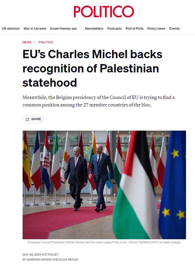 據(jù)《政客網(wǎng)》歐洲版28日報(bào)道,盡管歐洲各國政府在何時或是否承認(rèn)巴勒斯坦國問題上仍然存在分歧,但歐洲理事會主席查爾斯·米歇爾表示他將支持這一舉措。