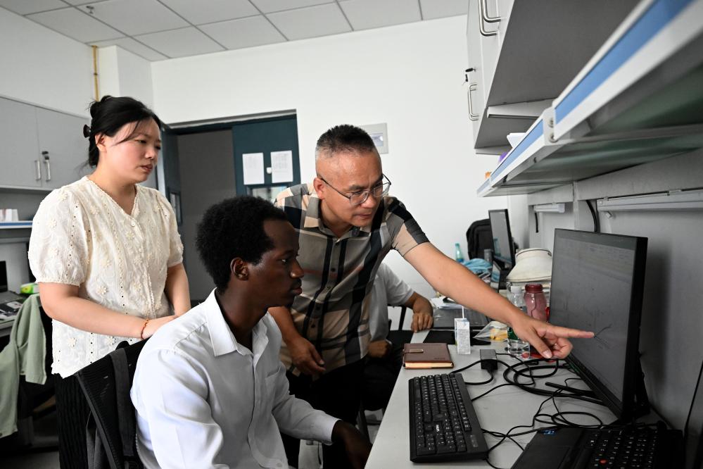 8月13日,在位于安徽省合肥市的安徽農業(yè)大學,中方導師在指導一名盧旺達學生和其他學生學習。新華社記者黃博涵攝