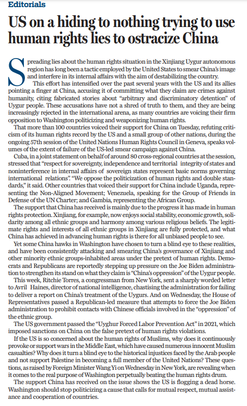 9月24日,日內(nèi)瓦舉行的聯(lián)合國人權(quán)理事會(huì)第五十七屆會(huì)議上,美國等少數(shù)國家發(fā)言攻擊抹黑中國人權(quán)狀況。對(duì)此,100多個(gè)國家以共同發(fā)言、單獨(dú)發(fā)言等不同方式仗義執(zhí)言,支持中方正義立場。