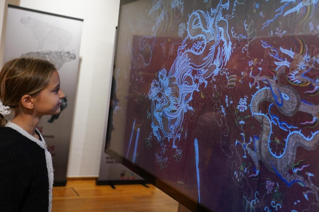 9月27日,在比利時布魯塞爾中國文化中心,觀眾在“看見中國”之《紋樣與色彩:中華工藝之美》數(shù)字文化展上參觀。新華社記者 彭子洋 攝