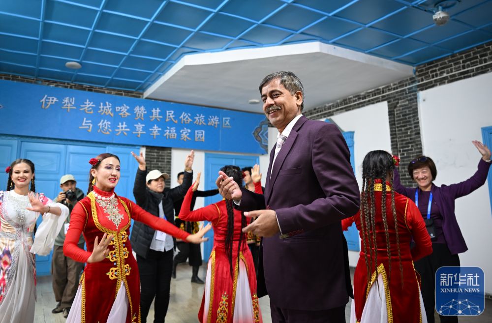 10月15日,與會(huì)嘉賓在伊寧市喀贊其民俗旅游區(qū)參訪。 新華社記者 劉續(xù) 攝