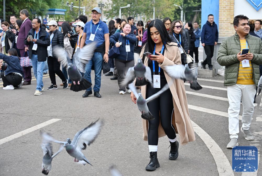 10月15日,與會(huì)嘉賓在伊寧市喀贊其民俗旅游區(qū)參訪。 新華社記者 李響 攝