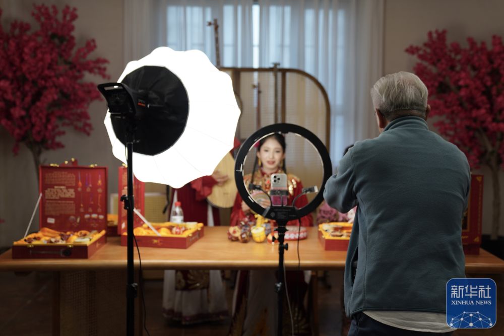 10月15日,與會(huì)嘉賓在阿克蘇地區(qū)新和縣加依村龜茲文化樂器展示中心觀看工作人員直播。 新華社記者 劉夢(mèng)琪 攝