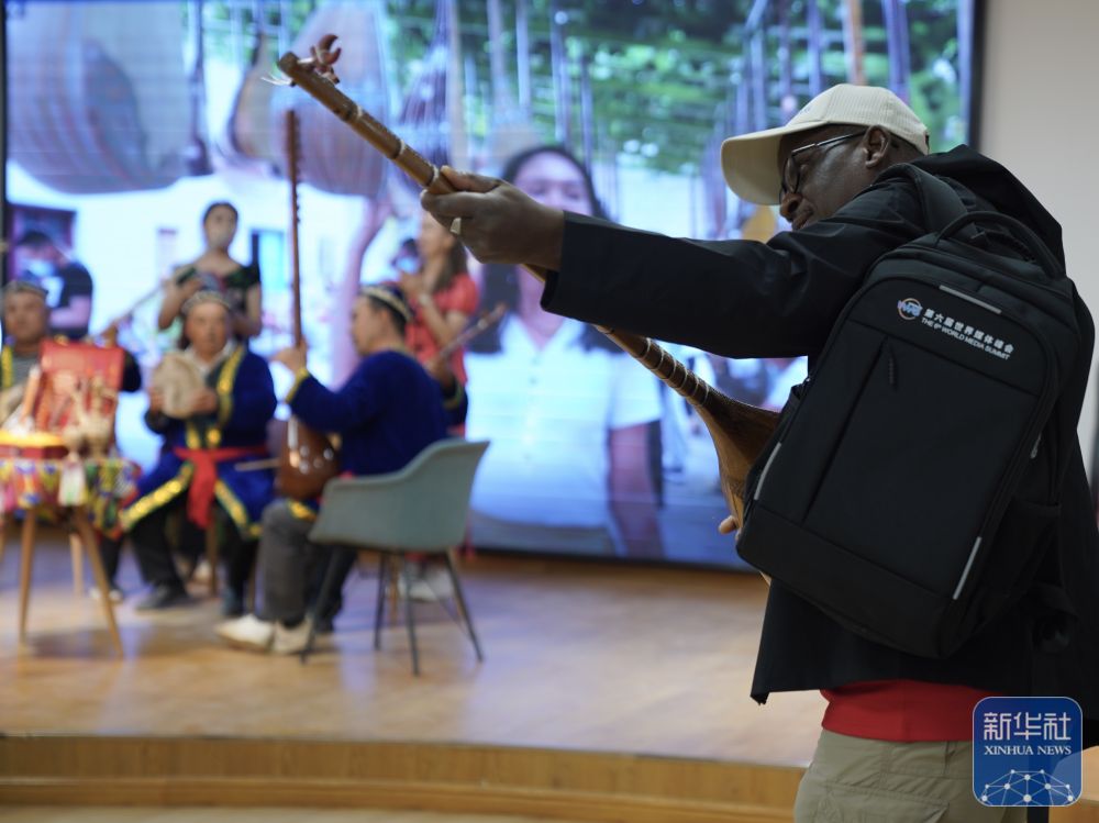 10月15日,與會(huì)嘉賓在阿克蘇地區(qū)新和縣加依村龜茲文化樂器展示中心與演員互動(dòng)。 新華社記者 陳朔 攝