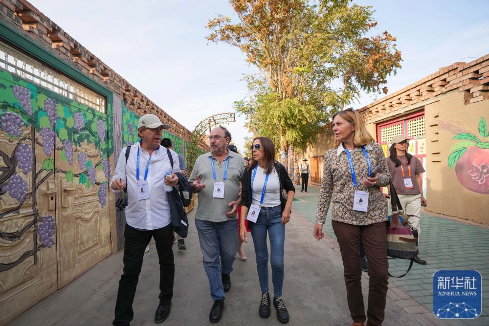 10月15日,與會(huì)嘉賓在吐魯番市高昌區(qū)亞爾鎮(zhèn)新城片區(qū)新城西門村參訪。 新華社記者 陳曄華 攝