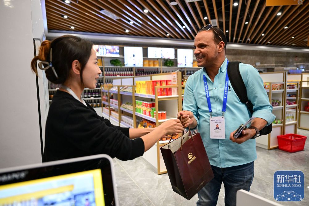 10月15日,與會(huì)嘉賓在新疆喀什跨境電商進(jìn)出口商品展示交易中心購物。 新華社記者 丁磊 攝