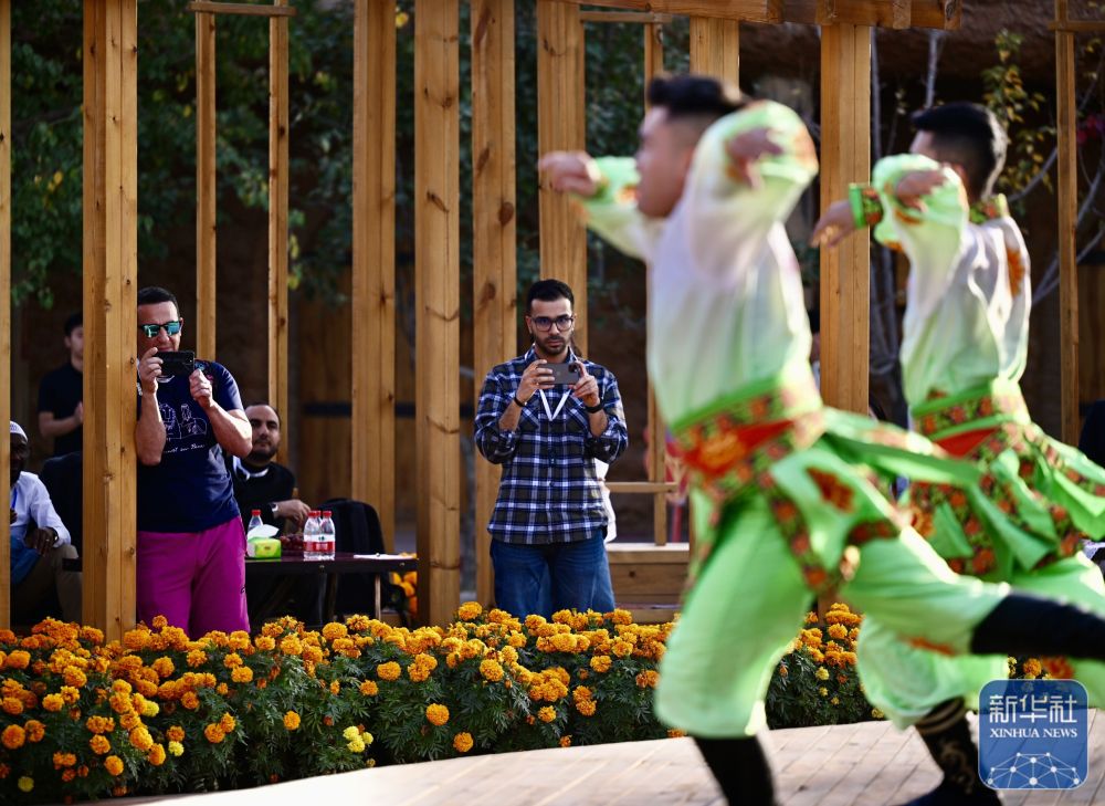 10月15日,與會(huì)嘉賓在伊寧市喀贊其民俗旅游區(qū)與表演者互動(dòng)。 新華社記者 牟宇 攝