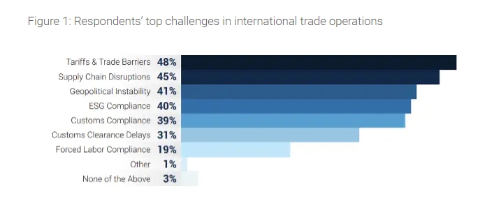 調(diào)查顯示,48%的受訪者認為關(guān)稅和貿(mào)易壁壘上升是他們最擔心的問題,緊隨其后的是供應(yīng)鏈中斷(45%)和地緣政治不穩(wěn)定(41%)。此外,無論所在公司規(guī)模大小,受訪者都將關(guān)稅和貿(mào)易壁壘列為當前面臨的首要問題。這項報告共調(diào)查了978名來自歐洲、北美、南美和亞太地區(qū)主要貿(mào)易國的供應(yīng)鏈領(lǐng)域領(lǐng)導(dǎo)者。
