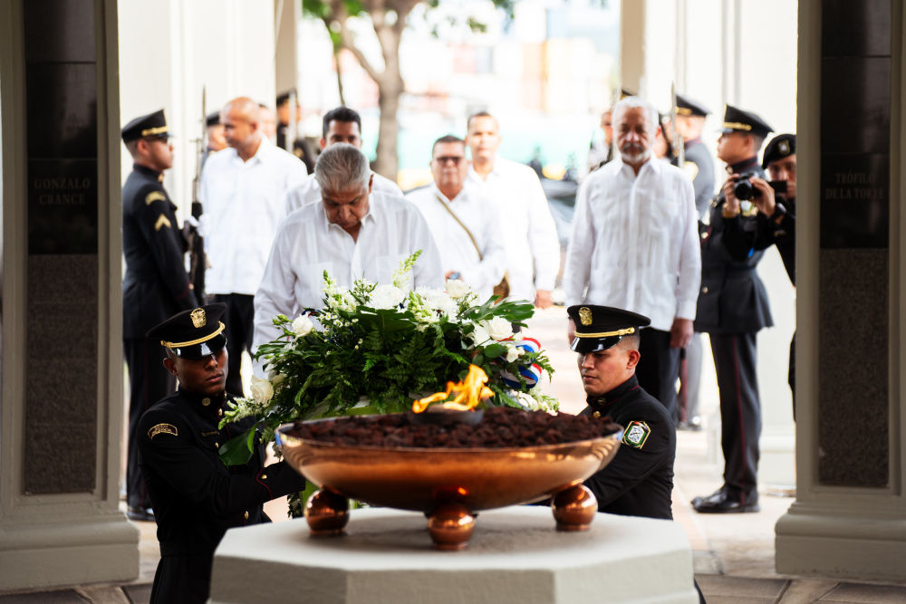 1月9日,在巴拿馬首都巴拿馬城,巴拿馬總統(tǒng)穆利諾(前中)向紀(jì)念1964年“護(hù)旗運(yùn)動”的“永恒之火”紀(jì)念碑獻(xiàn)花圈。新華社記者許詠政攝