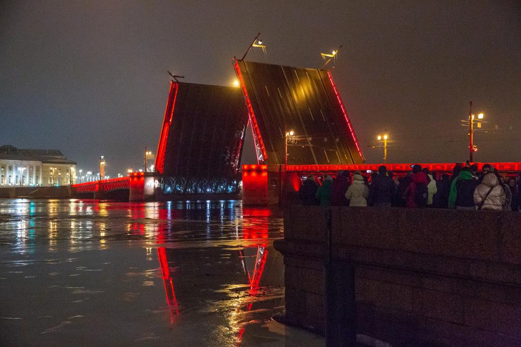 1月29日凌晨,在俄羅斯圣彼得堡,人們?cè)谀吆优嫌^看亮起“中國(guó)紅”的冬宮橋開(kāi)橋。新華社發(fā)(莫京娜攝)