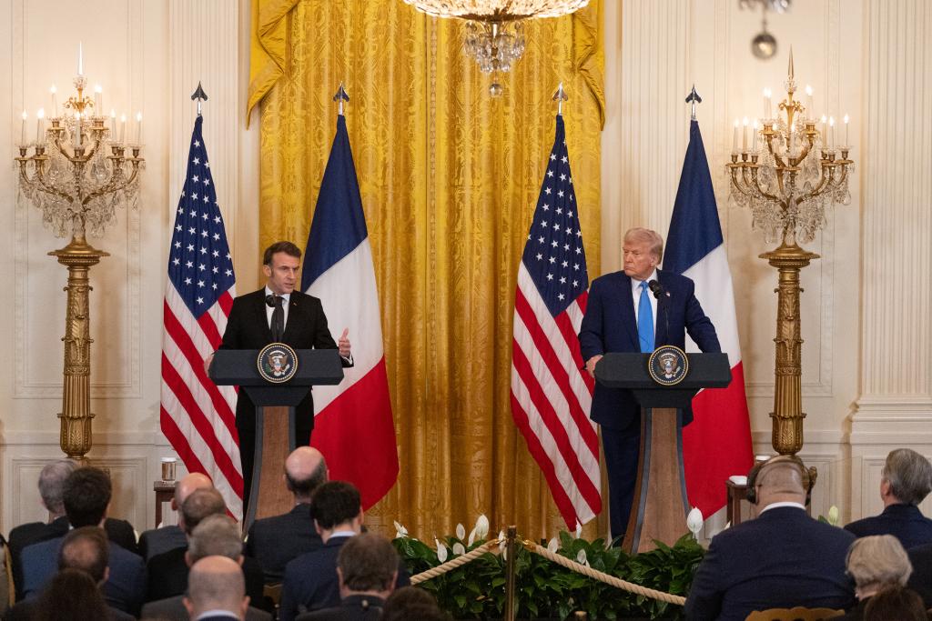 2月24日,美國總統(tǒng)特朗普(右)在華盛頓白宮與到訪的法國總統(tǒng)馬克龍舉行聯(lián)合記者會。新華社記者胡友松攝