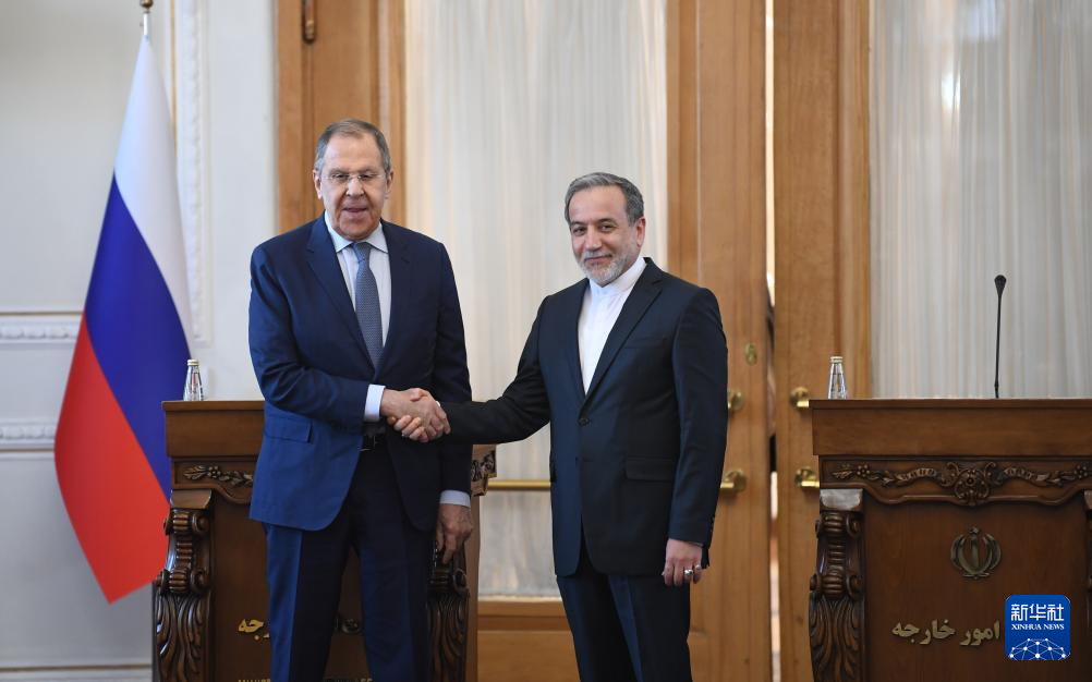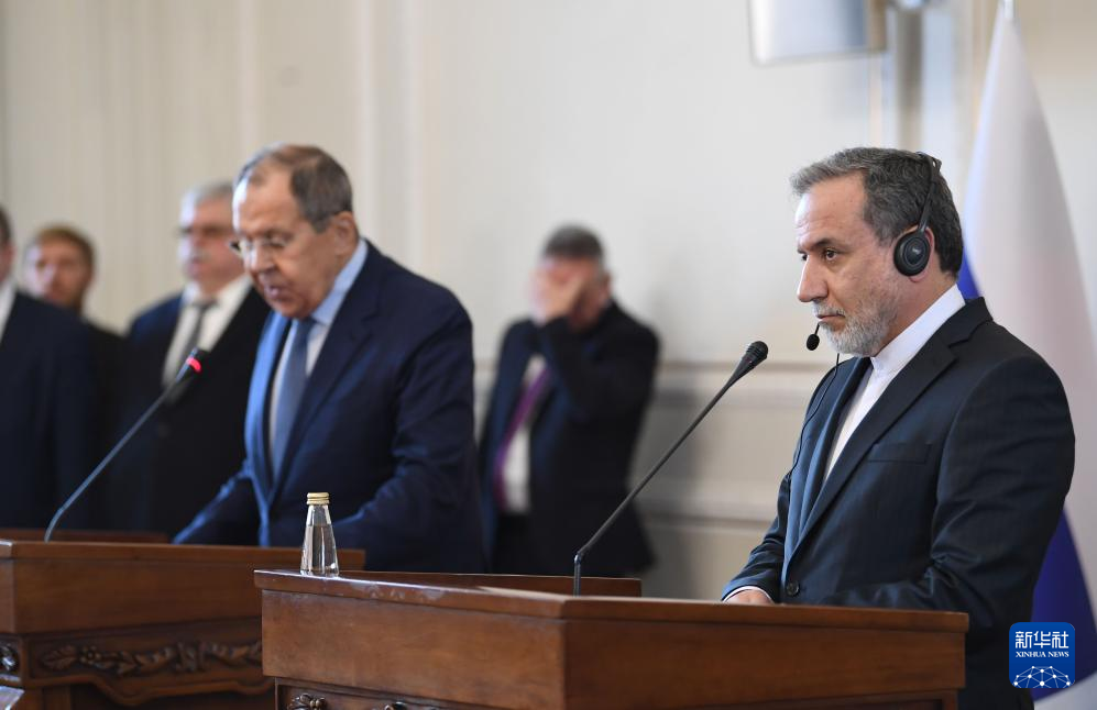 2月25日,在伊朗德黑蘭,伊朗外交部長阿拉格齊(右)與俄羅斯外長拉夫羅夫出席聯(lián)合新聞發(fā)布會(huì)。新華社記者 沙達(dá)提 攝