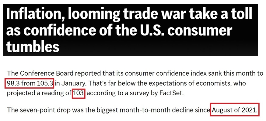 報(bào)道稱,特朗普是因?yàn)橄蛎绹顺兄Z會降低通脹和物價(jià)才當(dāng)選總統(tǒng)的。在他獲勝后,美國企業(yè)和消費(fèi)者信心曾一度飆升。但他在上任后的僅僅一個月內(nèi)就宣布了連串加征關(guān)稅計(jì)劃,從而“導(dǎo)致美國消費(fèi)者信心暴跌至八個月以來的最低點(diǎn)”。