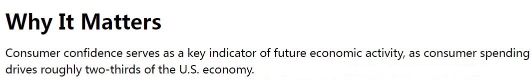 CCI既反映美國人對當(dāng)前經(jīng)濟(jì)狀況的評估,也反映他們對未來六個月的展望,是預(yù)測美國未來經(jīng)濟(jì)前景的關(guān)鍵指標(biāo)。