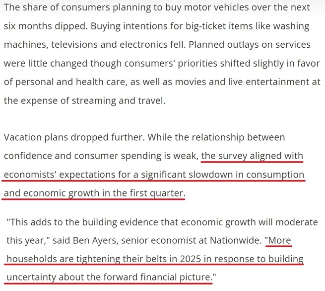 調(diào)查報(bào)告顯示,2月CCI顯著下降主要是由于美國消費(fèi)者對收入前景、商業(yè)環(huán)境和勞動力市場的看法更加悲觀,對這些方面的短期預(yù)測指數(shù)從1月的82.2下降到了72.9,自2024年6月以來首次跌破80的門檻。